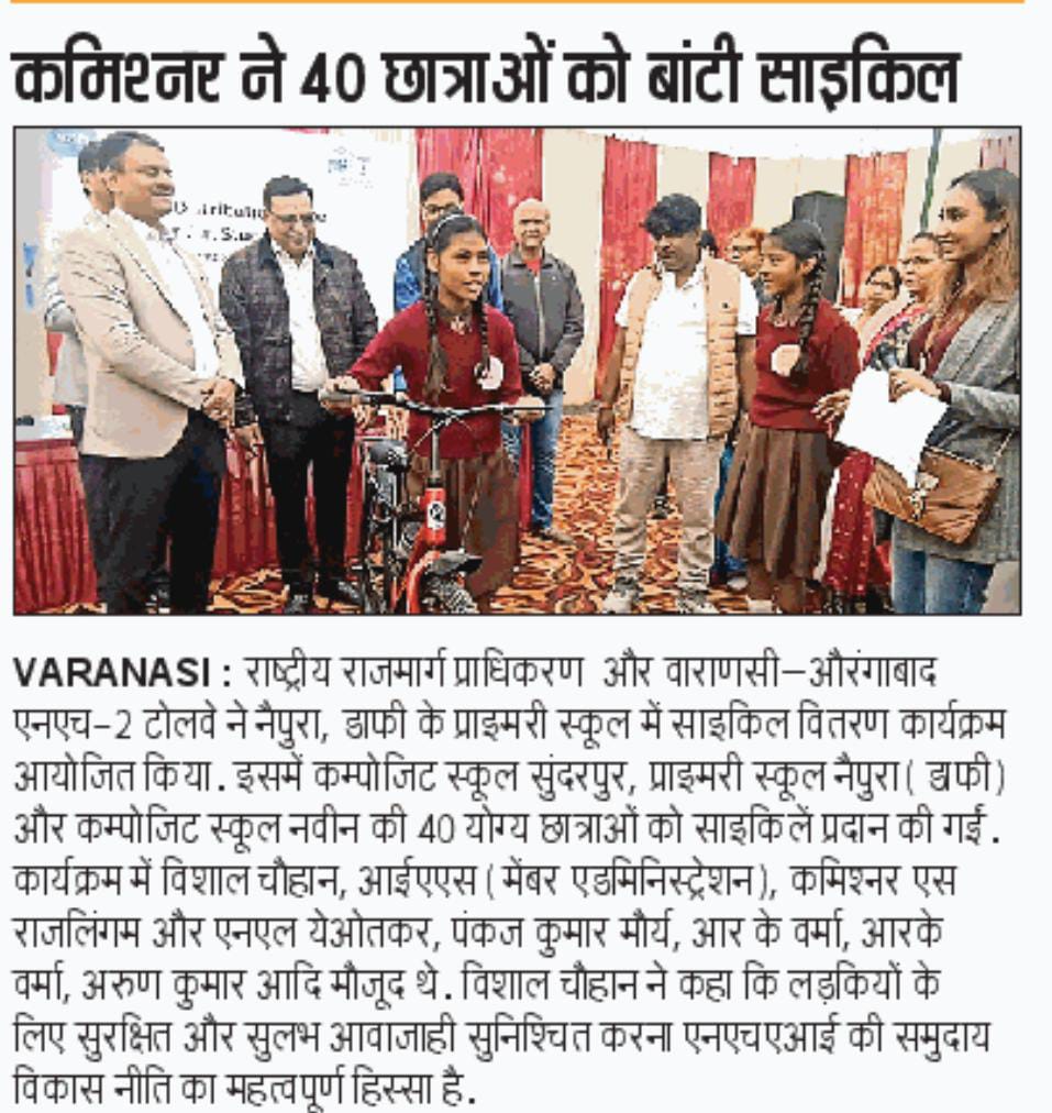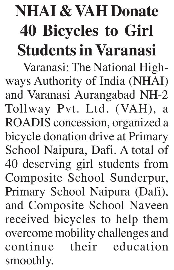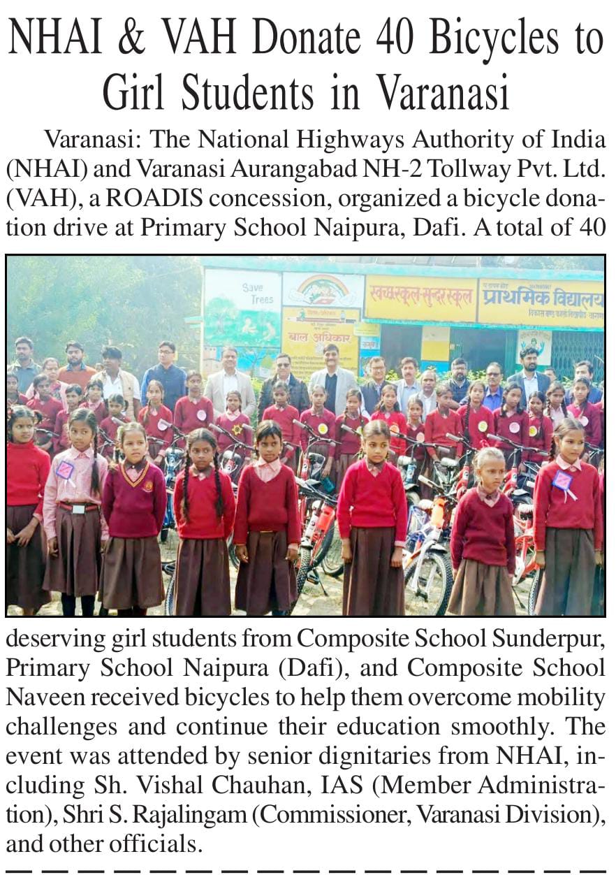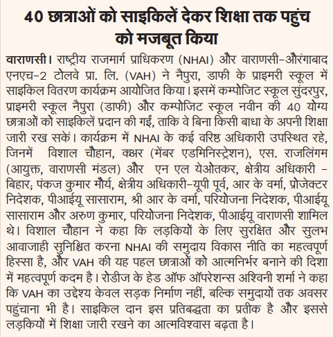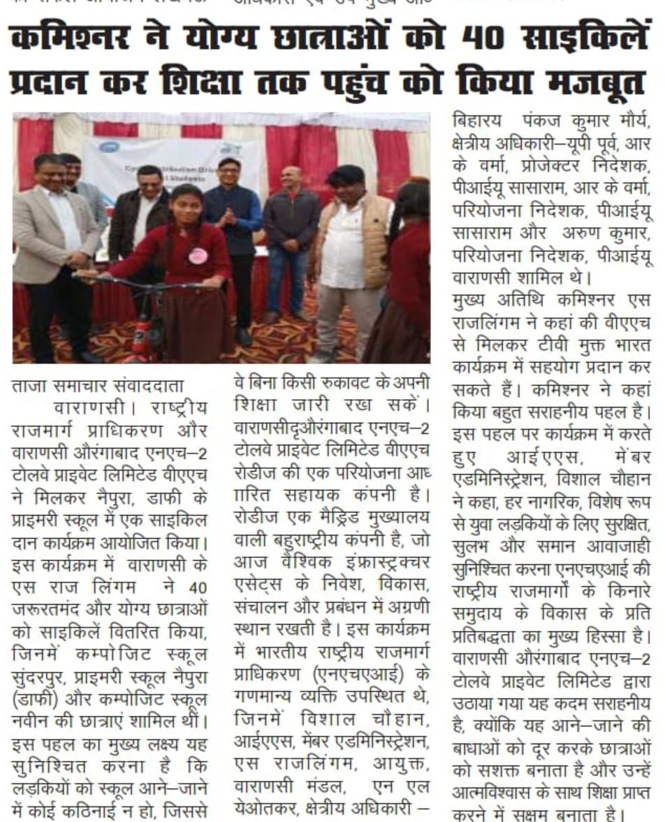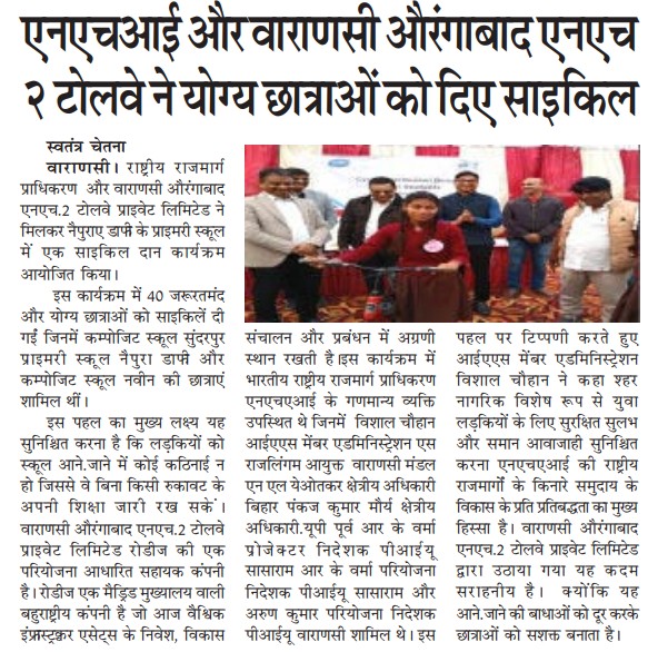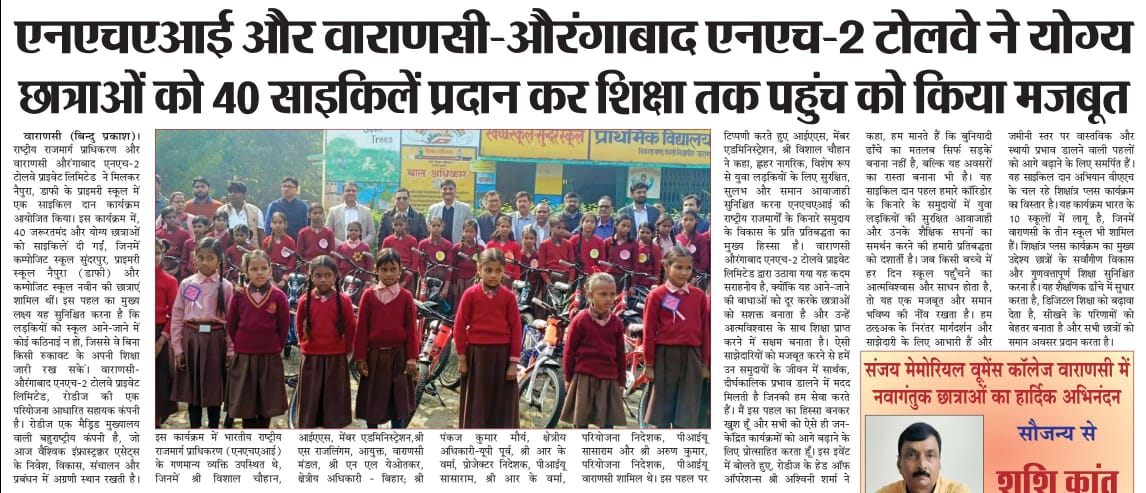 एनएचएआई और वाराणसी-औरंगाबाद एनएच-2 टोलवे ने योग्य छात्राओं को 40 साइकिलें प्रदान कर शिक्षा तक पहुंच को किया मजबूत.