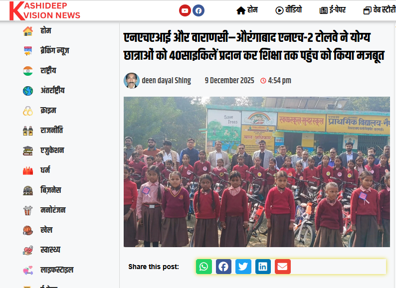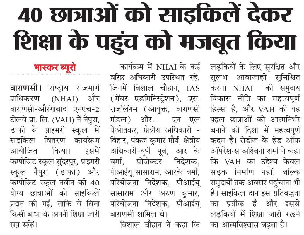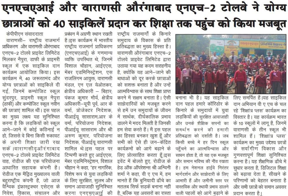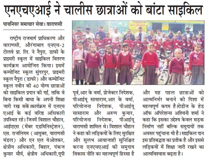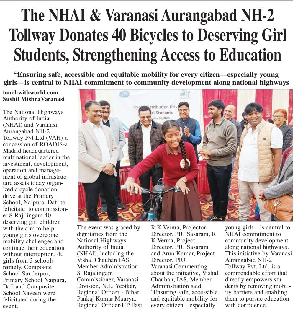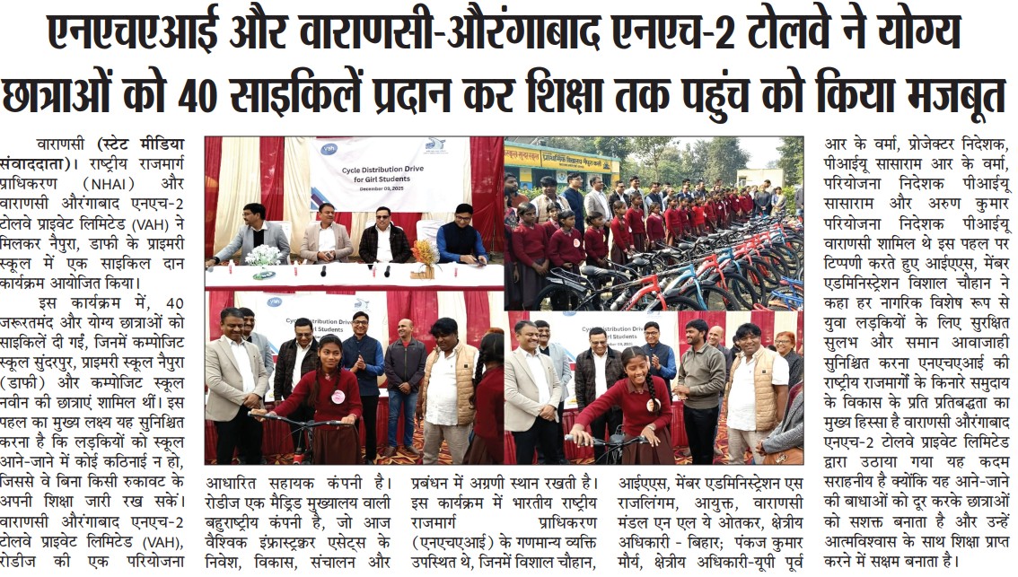 एनएचएआई और वाराणसी-औरंगाबाद एनएच-2 टोलवे ने योग्य छात्राओं को 40 साइकिलें प्रदान कर शिक्षा तक पहुंच को किया मजबूत.
