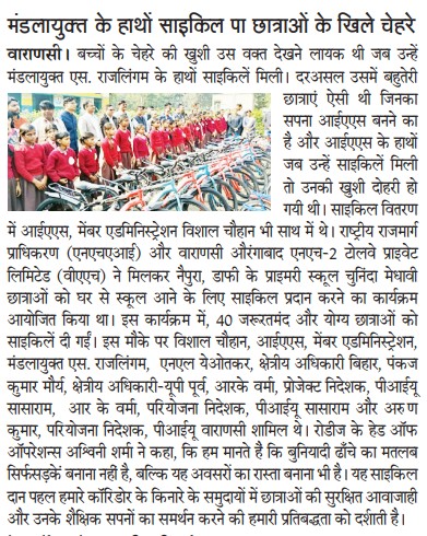 एनएचआई और वाराणसी औरंगाबाद एनएच २ टोलवे ने योग्य छात्राओं को दिए साइकिल
